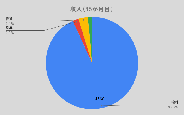15月目は、収入が$4,900、支出が$912 で、月間の収支は$3,988となりました。